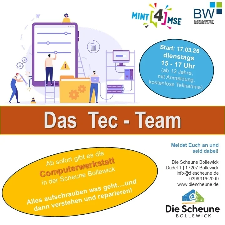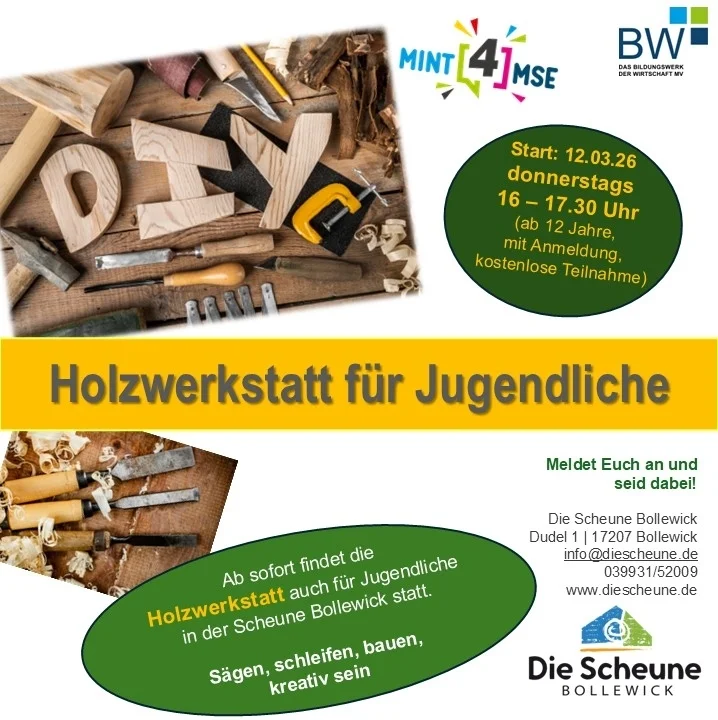 Ab dem 12.03.2026 startet wieder ein neuer Kurs der Holzwerkstatt 💫in der Scheune Bollewick.Für Jungen und Mädchen ab 7 Jahren, mit Anmeldung!kostenlose Teilnahme! 💥Meldet Euch an und seid dabei!Die Scheune … Weiterlesen